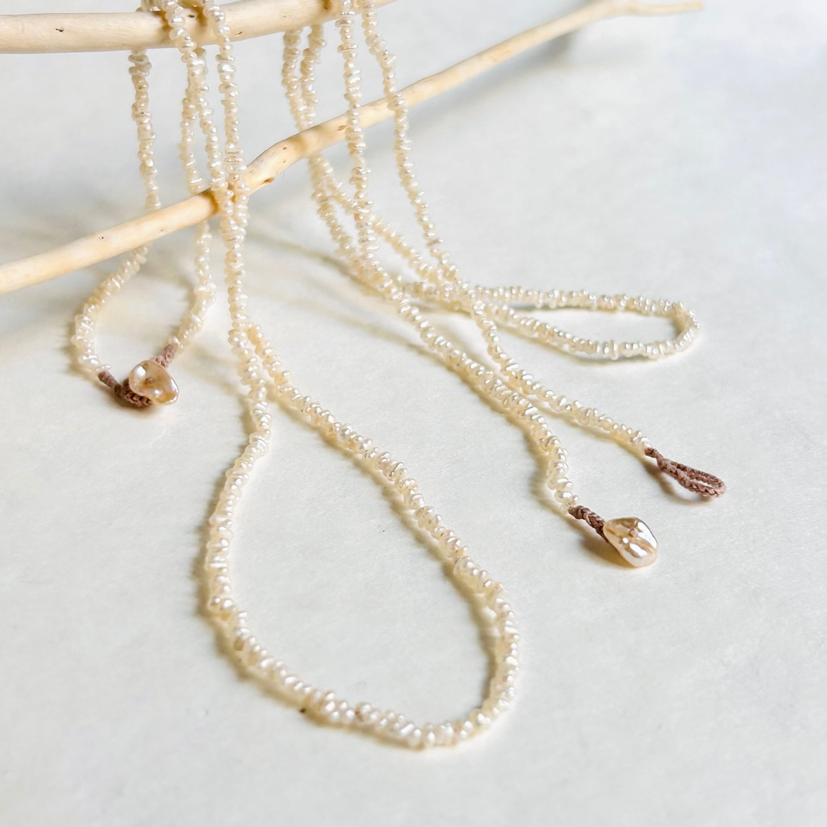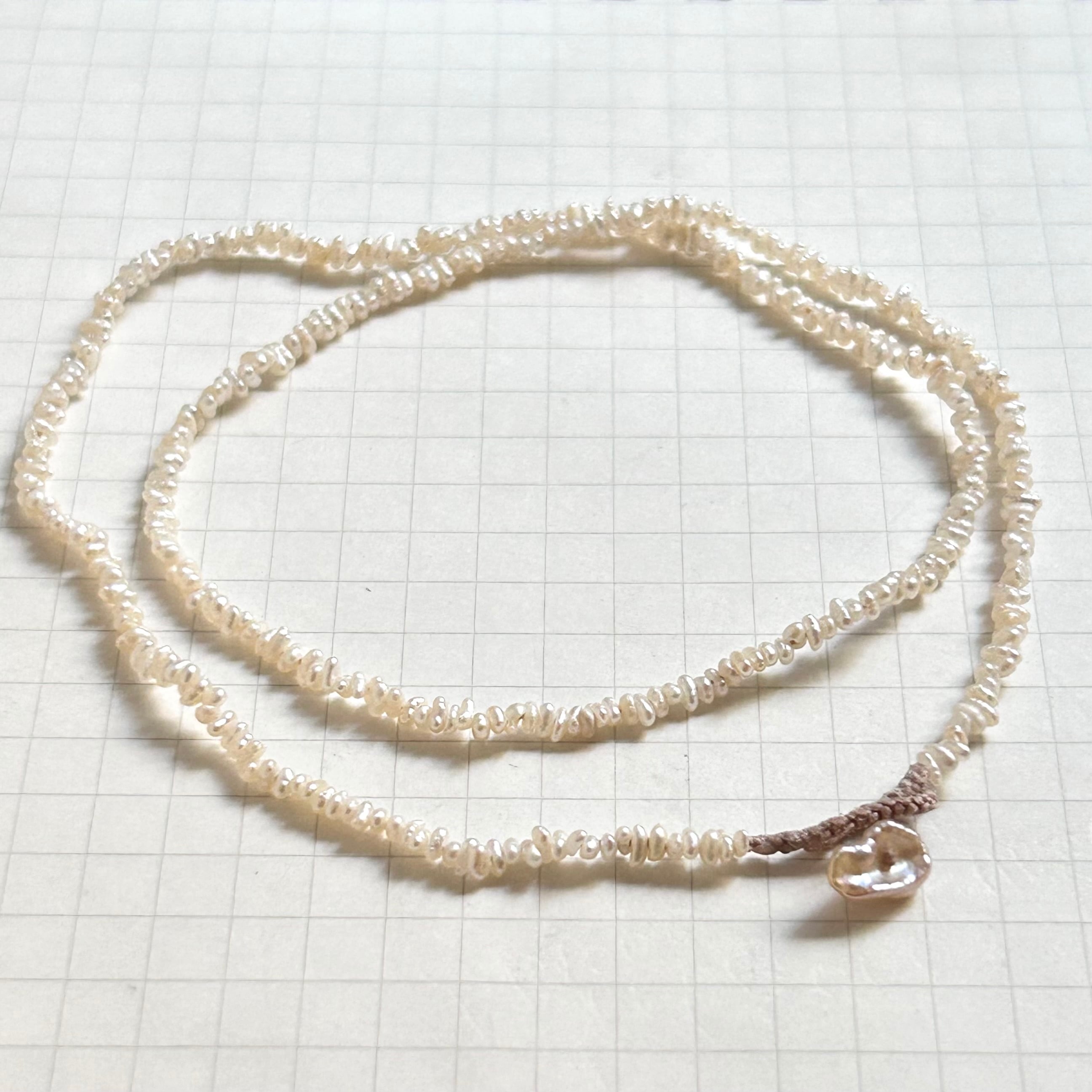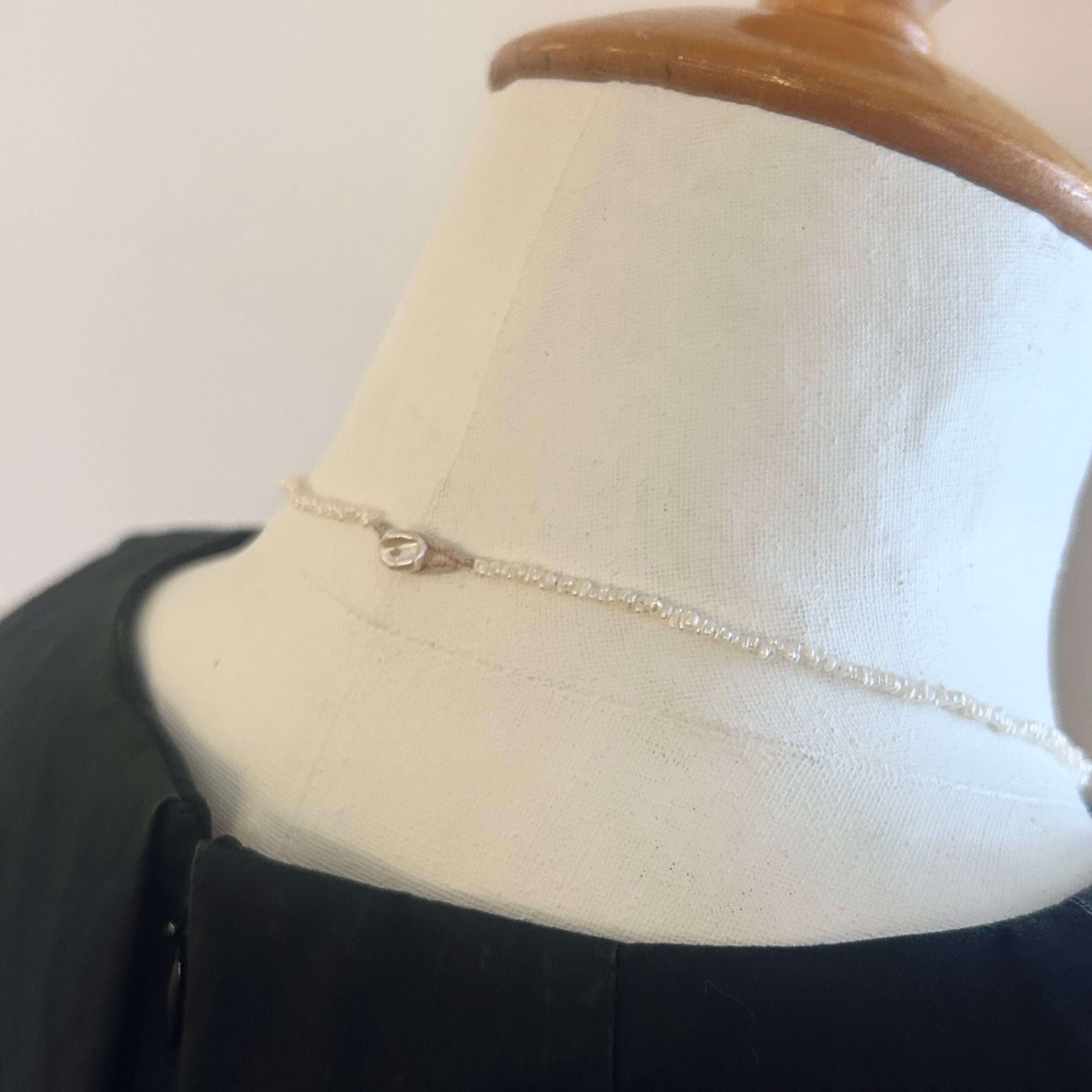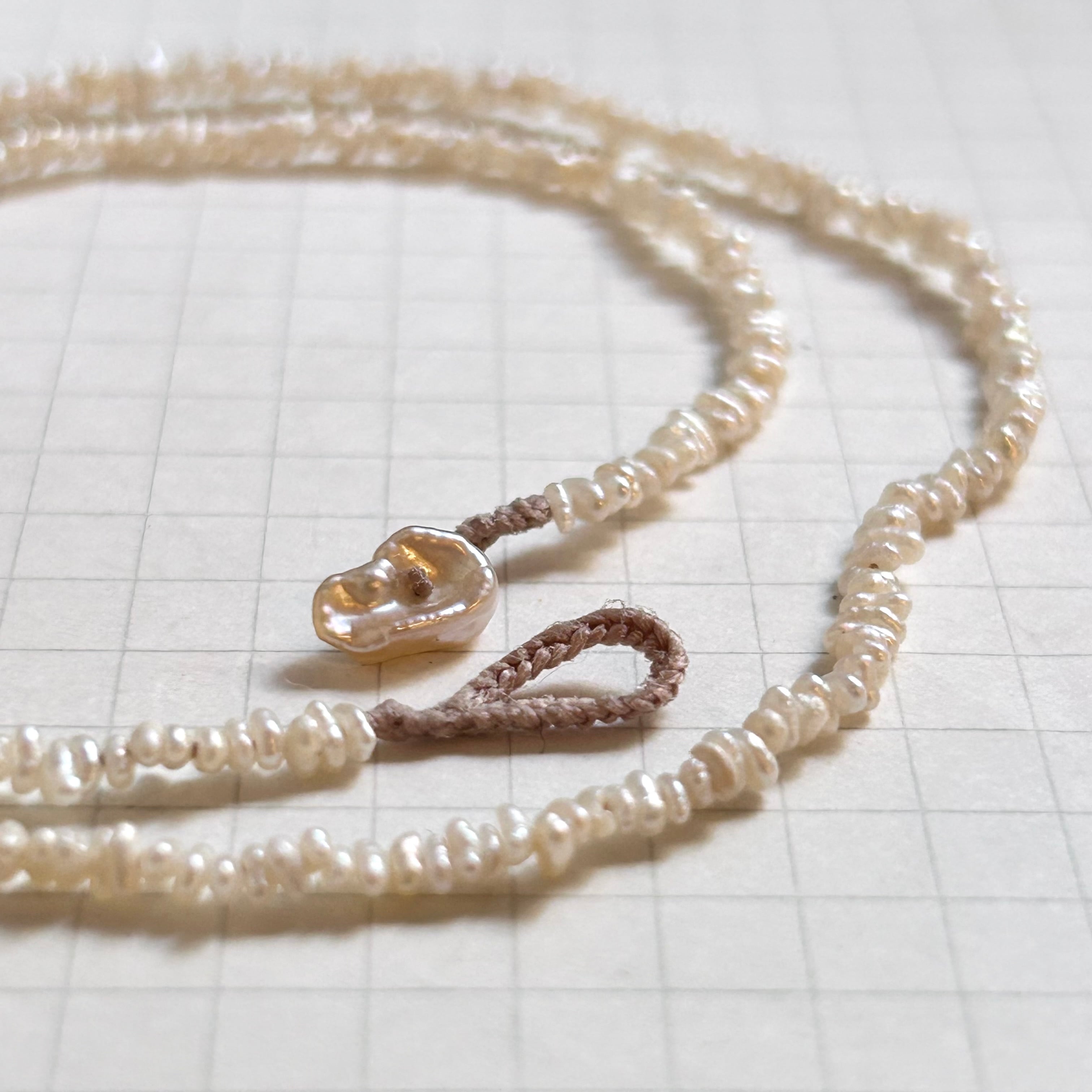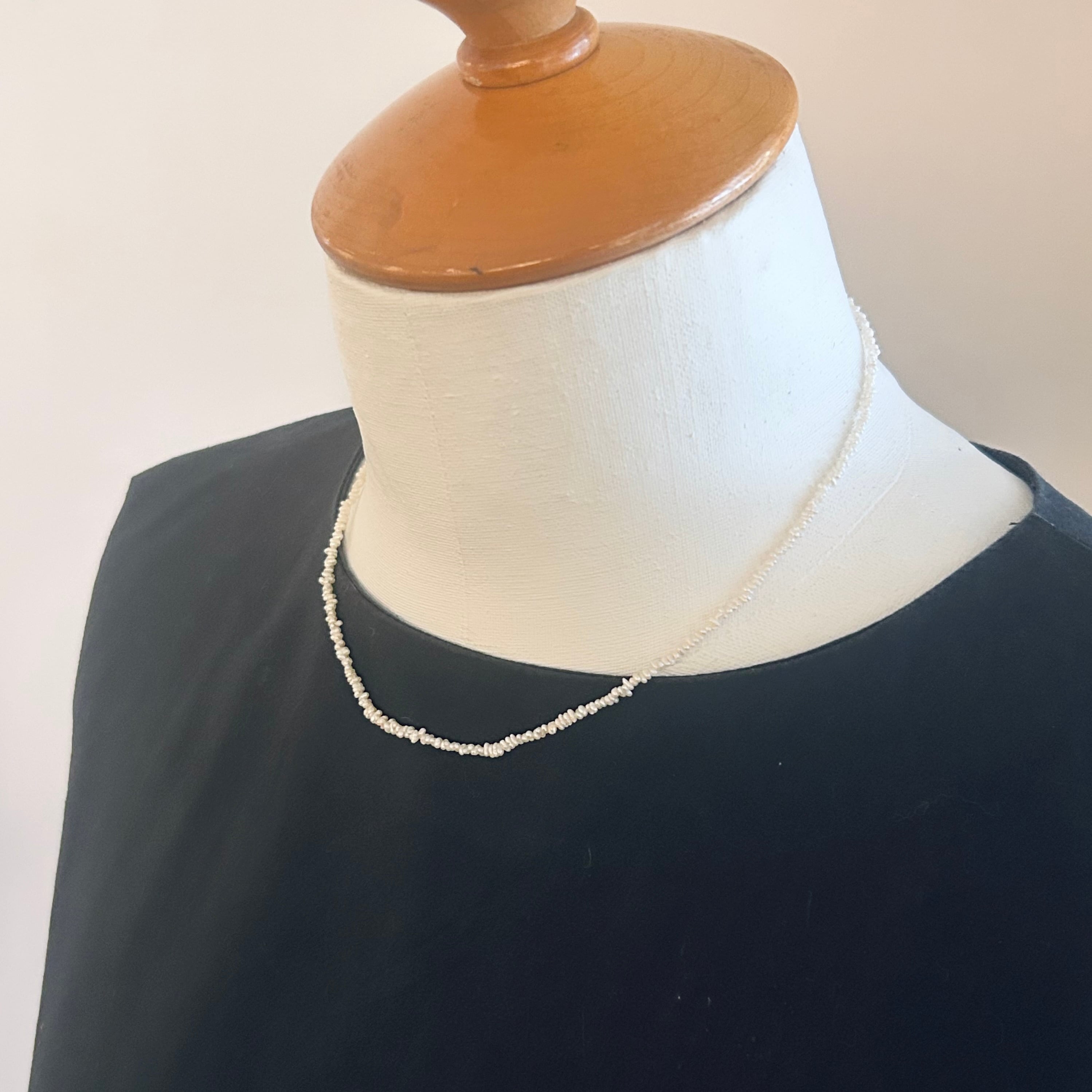 いびつで不揃いな形が可愛らしい、小さいながらも光沢のある淡水パールのネックレスです。